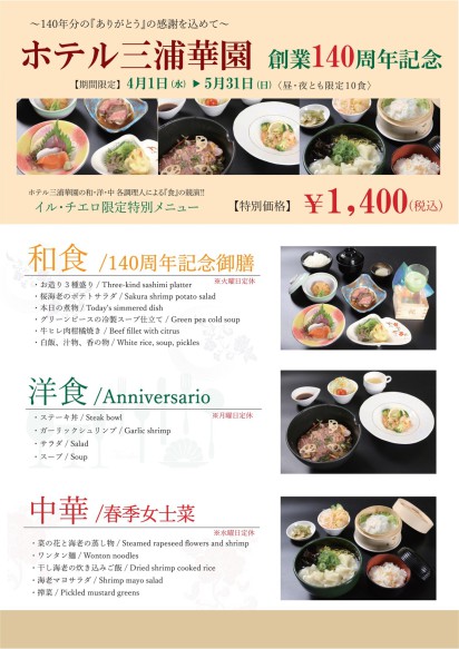 ホテル三浦華園創業140周年特別企画 イル・チエロ「スペシャルメニュー」のご案内